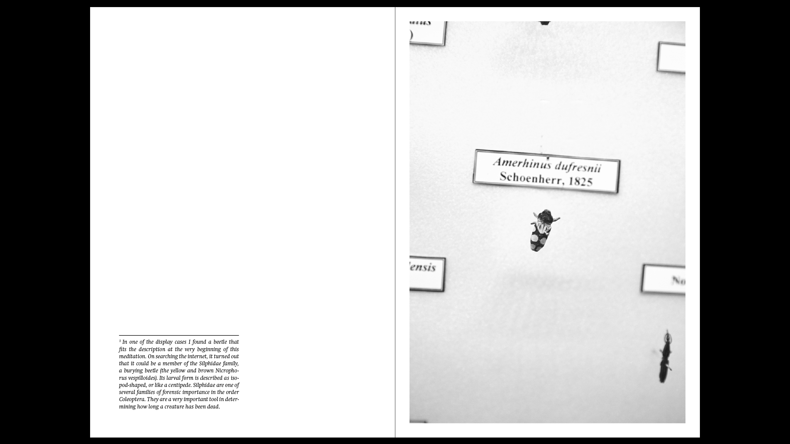 For our work we used a script provided by an animal communicator – a kind of guided meditation (also known as animal meditation) during which we politely approached those animals that had caught our attention while exploring the collection. To familiarise ourselves with the collection we began by photographing a large number of the specimens. Later we each chose one picture of an animal, with which we’d had contact, for the presentation. The texts are transcriptions of the perceptions, imaginations and knowledge we gained in the process of slipping into the body of the animal individuals. For a short time we were shape-shifters, we experienced the world from the point of view of these animals.