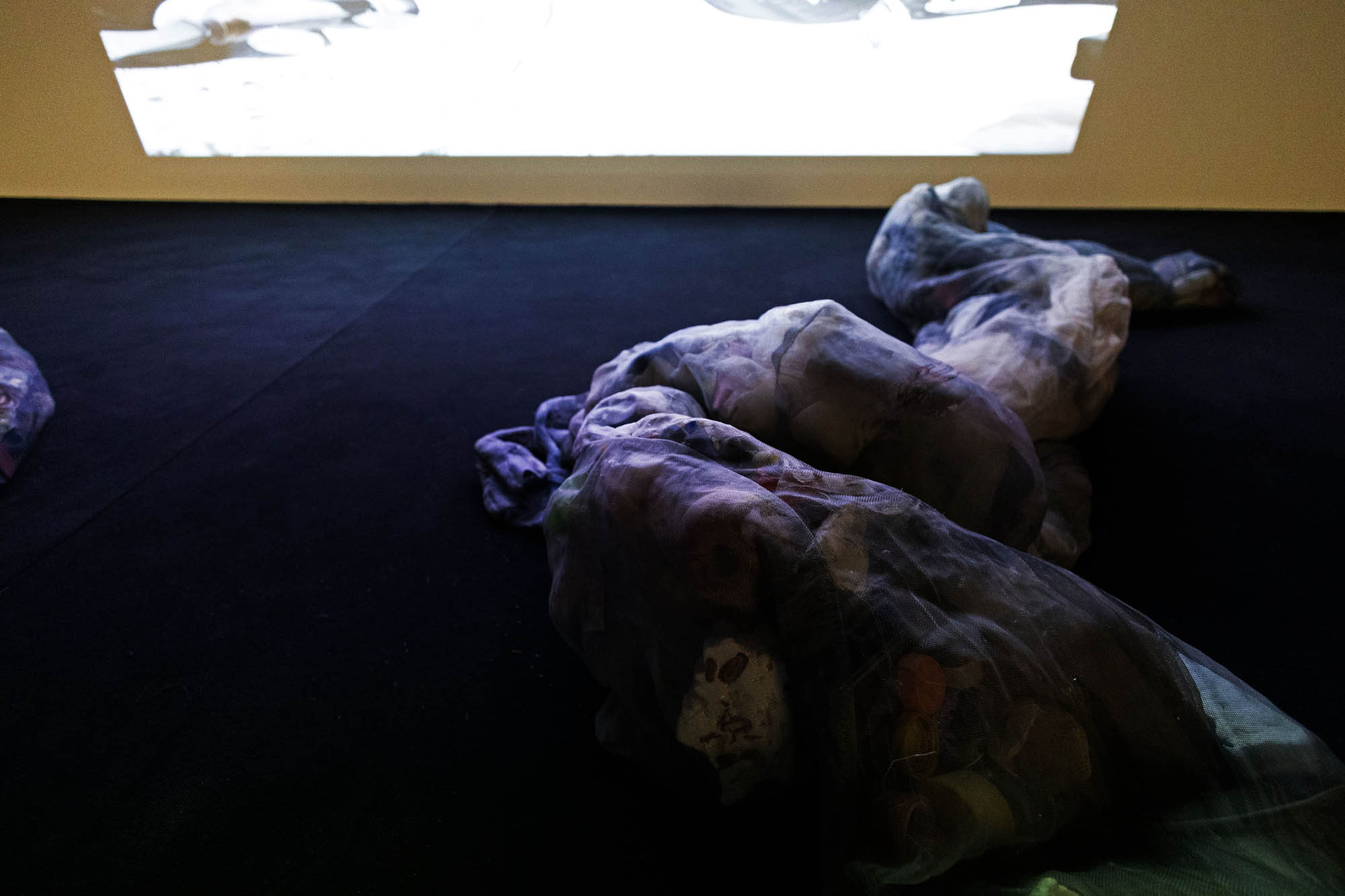Installation, Film: CG experimental film, 15:00 min, Color, Stereo Sound | Sculptures: 3D printed PLA, plastic trash from the Mediterranean Sea, upcycled plastic mesh from land agriculture.